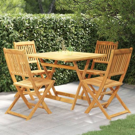 Setzen Sie sich für ein schönes Abendessen oder Brunch in Ihren Außenbereich an dieser klappbaren Garten-Essgruppe aus Holz. Diese Essgruppe besteht aus massivem Akazienholz und ist daher robust und stabil. Die geölte Oberfläche ist leicht mit einem feuchten Tuch zu reinigen. Zusätzlich hat diese Tischplatte in der Mitte ein Loch zum Halten eines Sonnenschirms. Der Esstisch und die Stühle können bei Nichtgebrauch platzsparend zusammengeklappt werden.
