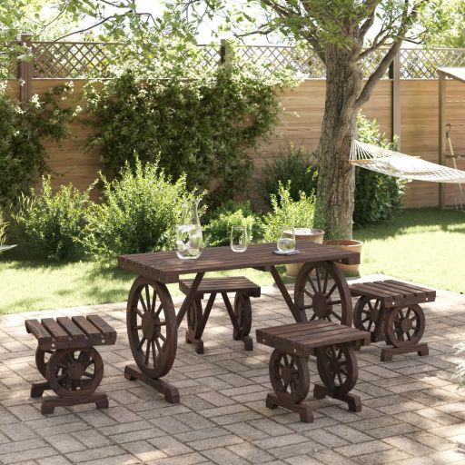 Genieße eine angenehme Mahlzeit oder einen Nachmittagstee in deinem Außenbereich an dieser Essgruppe aus Holz! Tannen-Massivholz: Massives Tannenholz ist ein schönes und widerstandsfähiges Material, das feuchtigkeitsbeständig bleibt. Dieses Massivholz trocknet nicht aus und verzieht sich nicht, was es zu einer zuverlässigen Wahl macht.Praktischer Tisch: Der Gartentisch bietet den perfekten Platz für Getränke, Speisen oder einige Dekoartikel.Attraktives Design: Die Outdoor-Sitzgruppe in Wagenrad-Look ist aus jedem Blickwinkel ein Blickfang. Gut zu wissen:Wir empfehlen dir, deine Gartenmöbel mit einer wasserdichten Hülle zu schützen, um lange Zeit eine ansprechende Optik aufzuweisen.