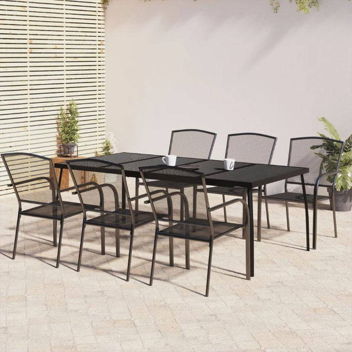 Diese trendige Garten-Essgruppe mit elegantem und modernem Design ist die perfekte Wahl für die Entspannung in deinem Outdoor-Wohnbereich. Robustes Material: Stahl ist ein außergewöhnlich hartes und starkes Material. Er bietet Robustheit und Stabilität. Die Pulverbeschichtung und die E-Beschichtung bilden eine Schutzschicht gegen Verschleiß und Korrosion.Stabiler Rahmen: Der pulverbeschichtete und emaillierte Stahlrahmen sorgt für die Robustheit und Stabilität des Esstisch- und Stühle-Sets.Stapelbar: Die Esszimmerstühle sind stapelbar, um bei Nichtgebrauch Platz zu sparen.Praktischer Tisch: Die robuste Tischplatte des Esstisches eignet sich perfekt zum Abstellen von Speisen, Getränken und anderen dekorativen Gegenständen.Elegante Beine: Die geschwungenen Beine des Gartentischs sorgen für Eleganz und gleichzeitig für Stabilität.Netzgitter: Mit ihrem Netzgitter-Design weist die Outdoor-Essgruppe eine schlichte und zeitlose Optik auf und eignet sich für Balkone, Veranden, Gärten, Terrassen usw. Hinweis:Damit deine Gartenmöbel lange schön bleiben, empfehlen wir dir, sie mit einer wasserdichten Hülle zu schützen.