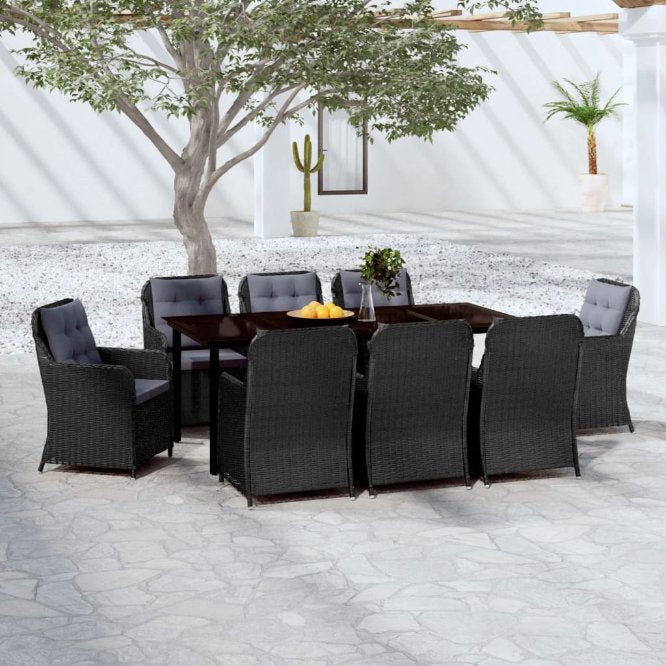 Genießen Sie eine angenehme Mahlzeit oder Ihren Nachmittagstee in Ihrem Außenbereich an dieser Garten-Essgruppe! Mit ihrem eleganten Design wird sie ein echter Hingucker in Ihrem Garten oder auf Ihrer Terrasse sein! Mit einem Stahlrahmen versehen, ist diese praktische Outdoor-Essgruppe robust und stabil. Die Gartenstühle bestehen aus wasserbeständigem und pflegeleichtem PE-Rattan und eignen sich daher perfekt für den Einsatz im Außenbereich. Die ergonomisch gestaltete Form und die dick gepolsterten, abnehmbaren Kissen mit Füllung aus Schaumstoff sorgen für höchsten Sitzkomfort. Die pflegeleichten Kissenbezüge aus Polyester können einfach abgenommen und gewaschen werden. Zudem lässt sich die glatte Tischplatte aus Glas mit einem feuchten Tuch einfach reinigen und bietet einen ausgezeichneten Platz für Speisen, Getränke und verschiedene Dekoartikel. Hinweis: Um die Lebensdauer deiner Gartenmöbel zu verlängern, empfehlen wir dir, sie mit einer wasserdichten Abdeckung zu schützen.