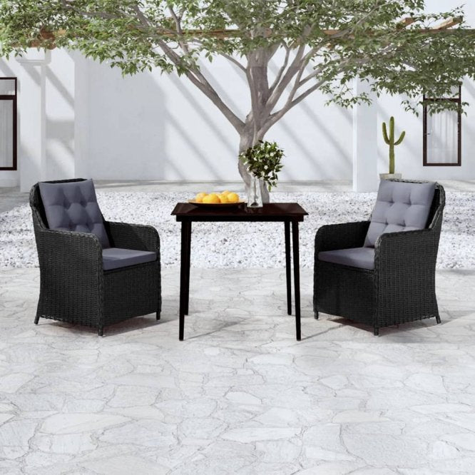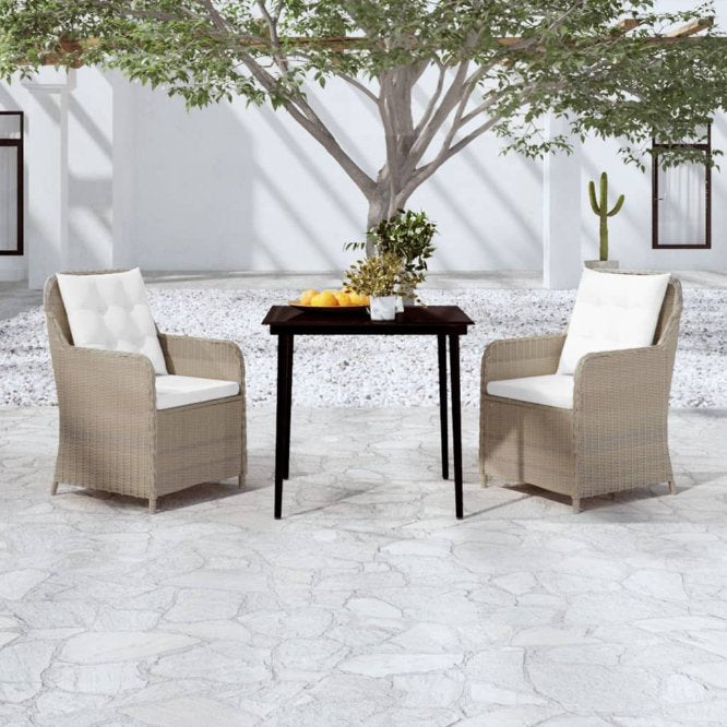 Genießen Sie eine angenehme Mahlzeit oder Ihren Nachmittagstee in Ihrem Außenbereich an dieser Garten-Essgruppe! Mit ihrem eleganten Design wird sie ein echter Hingucker in Ihrem Garten oder auf Ihrer Terrasse sein! Mit einem Stahlrahmen versehen, ist diese praktische Outdoor-Essgruppe robust und stabil. Die Gartenstühle bestehen aus wasserbeständigem und pflegeleichtem PE-Rattan und eignen sich daher perfekt für den Einsatz im Außenbereich. Die ergonomisch gestaltete Form und die dick gepolsterten, abnehmbaren Kissen mit Füllung aus Schaumstoff sorgen für höchsten Sitzkomfort. Die pflegeleichten Kissenbezüge aus Polyester können einfach abgenommen und gewaschen werden. Zudem lässt sich die glatte Tischplatte aus Glas mit einem feuchten Tuch einfach reinigen und bietet einen ausgezeichneten Platz für Speisen, Getränke und verschiedene Dekoartikel. Hinweis: Um die Lebensdauer deiner Gartenmöbel zu verlängern, empfehlen wir dir, sie mit einer wasserdichten Abdeckung zu schützen.