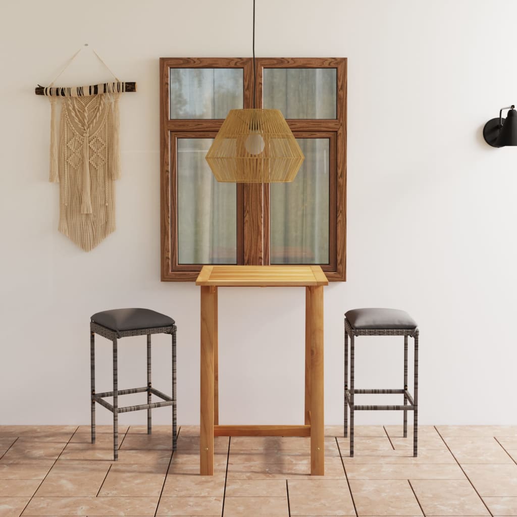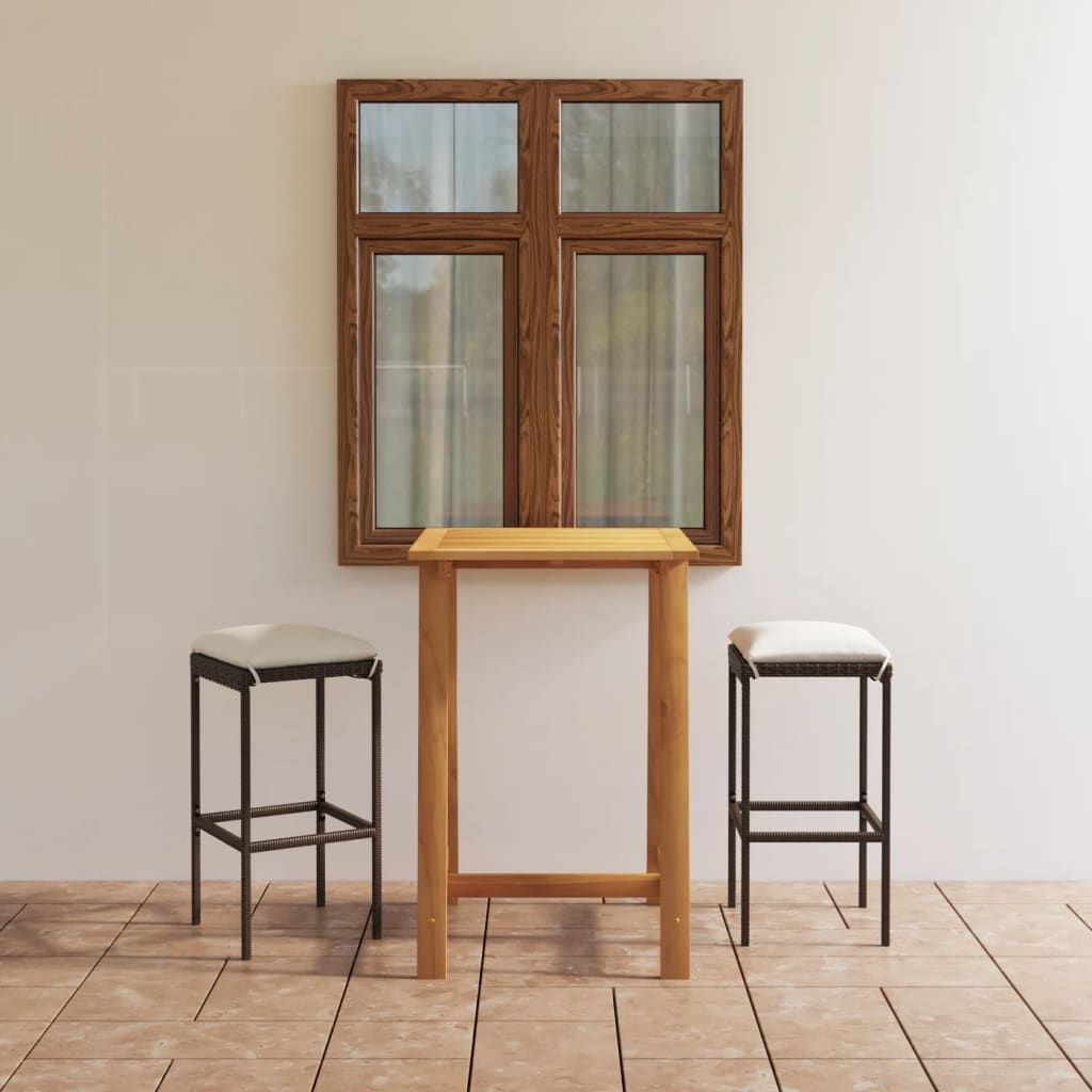Dieses Gartenbar-Set weist ein elegantes Design auf und wird ganz bestimmt der neue Blickfang in Ihrem Garten, auf dem Balkon oder auf Ihrer Terrasse sein. Der Tisch besteht aus massivem Akazienholz, das mit Öl behandelt ist. Somit ist er stabil, langlebig und pflegeleicht. Die Barhocker verfügen über ein pulverbeschichtetes Stahlgestell, das mit wetterbeständigem PE-Rattan überzogen ist, und sind daher robust und leicht zu reinigen. Die dicken, abnehmbaren Sitzkissen sorgen für höchsten Komfort. Dank Reißverschlüsse lassen sich die Kissenbezüge leicht abnehmen und waschen. Hinweis: Wir empfehlen, das Set bei Regen, Schnee und Frost abzudecken.