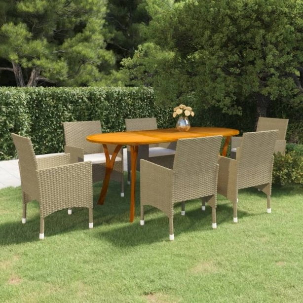 Schaffen Sie mit dieser Garten-Essgruppe eine überzeugende und zusammenhängende Ästhetik in Ihrem Außenbereich! Der Gartentisch ist aus massivem Akazienholz gefertigt, was ihn robust und stabil macht. Durch die mit Öl behandelte Oberfläche lässt sich der Tisch zudem mit einem feuchten Tuch leicht reinigen. Darüber hinaus tragen die geschwungenen Beine zu seinem stilvollen Design bei. Mit einem Stahlrahmen versehen, der mit wetterbeständigem PE-Rattan geflochten ist, sind die Essstühle robust und leicht zu reinigen. Die dick gepolsterten Kissen sorgen für zusätzlichen Komfort beim Entspannen. Hinweis: Um die Lebensdauer Ihrer Gartenmöbel zu verlängern, empfehlen wir Ihnen, diese regelmäßig zu reinigen und bei Nichtgebrauch im Freien abzudecken.Reinigung: Verwenden Sie eine milde SeifenlösungLagerung: Wenn möglich, an einem kühlen, trockenen Ort im Innenbereich lagern. Wenn das Produkt im Freien gelagert wird, schützen Sie es mit einer wasserdichten Abdeckung. Wischen und trocknen Sie das überschüssige Wasser oder den Schnee nach Regen oder Schneefall von der ebenen Fläche. Sorgen Sie für eine ausreichende Luftzirkulation, um feuchtigkeitsbedingte Schäden zu vermeiden.