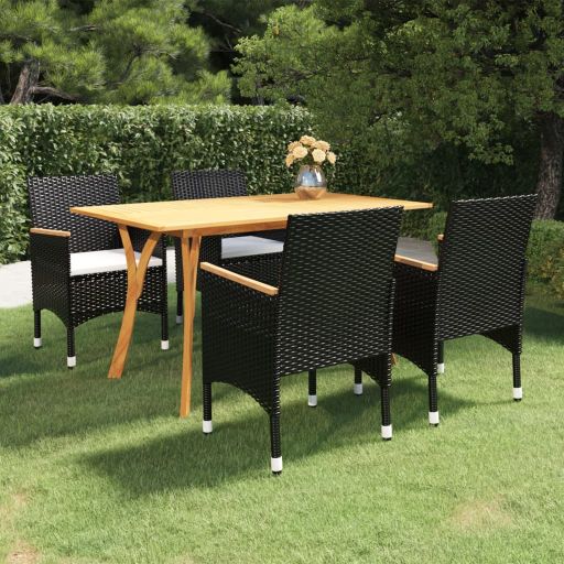 Schaffen Sie mit dieser Garten-Essgruppe eine überzeugende und zusammenhängende Ästhetik in Ihrem Außenbereich! Der Gartentisch ist aus massivem Akazienholz gefertigt, was ihn robust und stabil macht. Durch die mit Öl behandelte Oberfläche lässt sich der Tisch zudem mit einem feuchten Tuch leicht reinigen. Darüber hinaus tragen die geschwungenen Beine zu seinem stilvollen Design bei. Mit einem Stahlrahmen versehen, der mit wetterbeständigem PE-Rattan geflochten ist, sind die Essstühle robust und leicht zu reinigen. Die dick gepolsterten Kissen sorgen für zusätzlichen Komfort beim Entspannen. Hinweis: Um die Lebensdauer Ihrer Gartenmöbel zu verlängern, empfehlen wir Ihnen, diese regelmäßig zu reinigen und bei Nichtgebrauch im Freien abzudecken.Reinigung: Verwenden Sie eine milde SeifenlösungLagerung: Wenn möglich, an einem kühlen, trockenen Ort im Innenbereich lagern. Wenn das Produkt im Freien gelagert wird, schützen Sie es mit einer wasserdichten Abdeckung. Wischen und trocknen Sie das überschüssige Wasser oder den Schnee nach Regen oder Schneefall von der ebenen Fläche. Sorgen Sie für eine ausreichende Luftzirkulation, um feuchtigkeitsbedingte Schäden zu vermeiden.