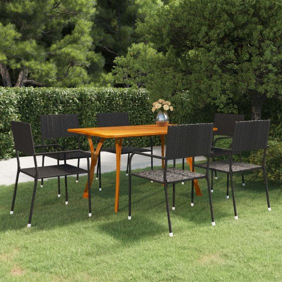 Schaffen Sie mit dieser Garten-Essgruppe eine überzeugende und zusammenhängende Ästhetik in Ihrem Außenbereich! Der Gartentisch ist aus massivem Akazienholz gefertigt, was ihn robust und stabil macht. Durch die ölbeschichtete Oberfläche lässt sich der Tisch zudem mit einem feuchten Tuch leicht reinigen. Darüber hinaus tragen die geschwungenen Beine zu seinem stilvollen Design bei. Mit einem Stahlrahmen versehen, der mit wetterfestem PE-Rattan überzogen ist, sind die Essstühle robust und leicht zu reinigen. Die Gartenstühle zeichnen sich durch ein geringes Eigengewicht aus und können bei Nichtgebrauch platzsparend aufeinander gestapelt werden. Hinweis: Um die Lebensdauer Ihrer Gartenmöbel zu verlängern, empfehlen wir Ihnen, diese regelmäßig zu reinigen und bei Nichtgebrauch im Freien abzudecken.Reinigung: Verwenden Sie eine milde SeifenlösungLagerung: Wenn möglich, an einem kühlen, trockenen Ort im Innenbereich lagern. Wenn das Produkt im Freien gelagert wird, schützen Sie es mit einer wasserdichten Abdeckung. Wischen und trocknen Sie das überschüssige Wasser oder den Schnee nach Regen oder Schneefall von der ebenen Fläche. Sorgen Sie für eine ausreichende Luftzirkulation, um feuchtigkeitsbedingte Schäden zu vermeiden.
