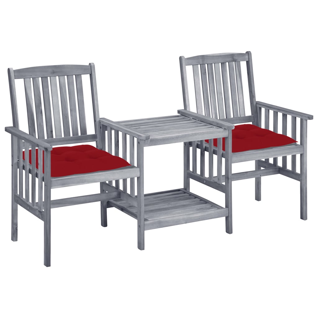 Erleben Sie eine wunderbare Teezeit mit diesen rustikalen Gartenstühlen mit Teetisch aus Holz. Sie werden eine wirklich benutzerfreundliche und auffällige Ergänzung zu Ihrem Garten oder Ihrer Terrasse sein. Der Tisch und die Stühle sind aus massivem Akazienholz gefertigt und dadurch äußerst stabil und robust. Die stabile Tischplatte und die untere Ablage bieten den idealen Platz für Tassen, Bücher und andere Kleinigkeiten. Die Rückenlehnen und Armlehnen der Stühle sorgen für ein erholsames Sitzerlebnis. Zudem sorgen die Kissen für zusätzlichen Komfort. Jedes Kissen verfügt über zwei Sätze Bänder, womit es fest am Bistro-Set befestigt werden kann. Hinweis: Um die Lebensdauer Ihrer Gartenmöbel zu verlängern, empfehlen wir Ihnen, diese regelmäßig zu reinigen und im Freien vor Niederschlägen oder starken Sonnenstrahlen zu schützen.Reinigung: Verwenden Sie eine milde SeifenlösungLagerung: Wenn möglich, an einem kühlen, trockenen Ort im Innenbereich lagern. Wenn das Produkt im Freien gelagert wird, schützen Sie es mit einer wasserdichten Abdeckung. Wischen und trocknen Sie das überschüssige Wasser oder den Schnee nach Regen oder Schneefall von ebenen Flächen. Sorgen Sie für eine ausreichende Luftzirkulation, um feuchtigkeitsbedingte Schäden zu vermeiden.